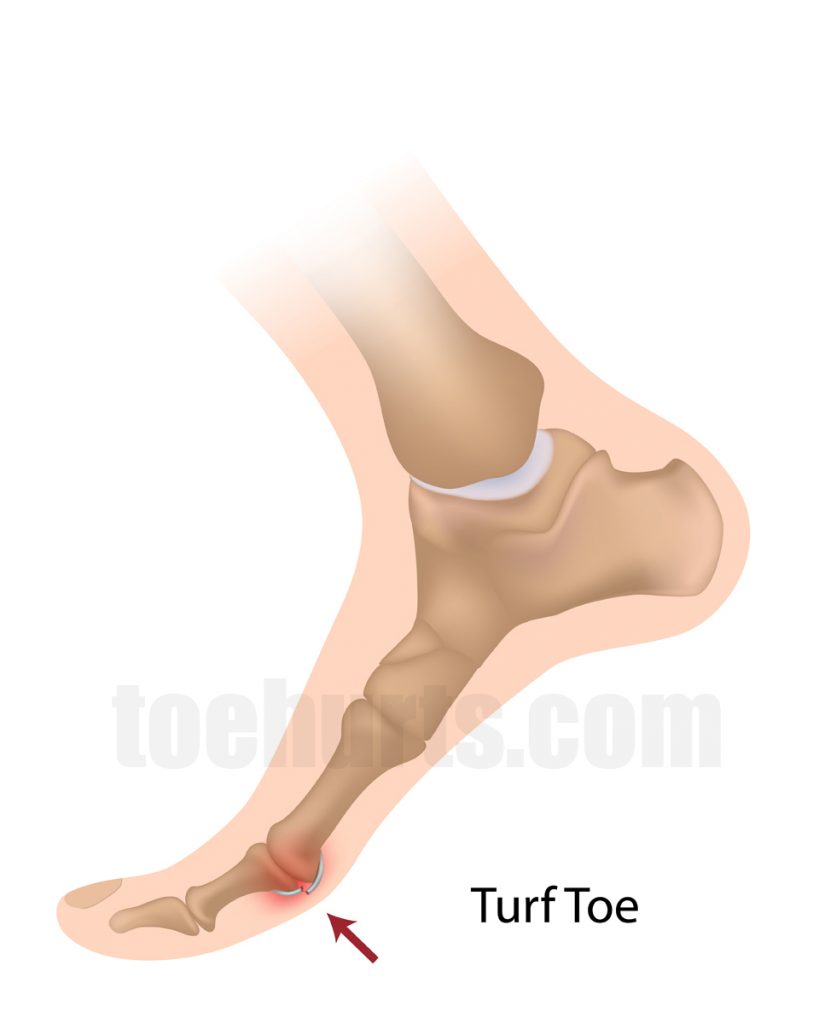 Turf toe gets its name from the fact that the injury is often sustained by people that spend a lot of time on artificial turf, but it can occur on virtually any type of surface. On artificial turf it’s common to wear types of footwear that possess studs, spikes, or blades that stick into the ground. When moving, it’s possible that an individual’s full body weight may continue to go forwards while their foot is stuck in the ground and their big toe is in a fully extended position, which results in what’s known as a “hyperextension” of the first metatarsophalangeal joint (MPJ), causing a sprain of the joint capsule. When this happens, it will usually be possible to see considerable bruising around the base of the big toe and the ligaments connected to the toe will be stretched, and sometimes may even tear. It’s also possible that the big toe may be dislocated due to the extreme amount of pressure placed on the toe. If you are unfortunate enough to suffer from turf toe, you will almost certainly experience considerable pain right after the injury is sustained, and over time the range of motion of the joint may be reduced. Turf toe also increases the likelihood of the development of arthritis.
